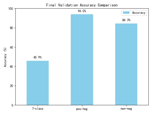 通过本次毕业设计,我在多模态情绪识别领域的理论与实践能力均得到了显著提升。在数据处理方面,我完成了CMU-MOSI和CMU-MOSEI数据集的合理划分与预处理工作,并设计了多模态融合质量的实时量化指标,为模型训练奠定了高质量数据基础。在模型评估中,我构建了涵盖分类任务(Precision、Recall、F1-Score等)和回归任务(MAE、CORR)的多维度评估体系,通过对比实验验证了MIER模型在情绪强度预测上的优势。在回答老师提问时,我学会了如何通过控制变量法设计严谨的实验方案,并从分类与回归双任务角度系统性地评价模型性能。此外,通过论文撰写和外文翻译,我掌握了学术表达的规范性,同时在Anaconda环境部署和PyTorch框架配置中提升了工程实践能力。整个过程让我深刻体会到理论与实践结合的重要性,也为未来在多模态领域的研究积累了宝贵经验。