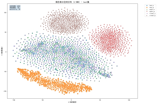 *成功生成多模态表示学习“空间分布TSNE图”,证实系统代码已实现基于共享-私有表示分离的多模态情绪判别模型MIER的最关键步骤——模态表示分离工作: