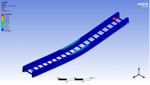 回答:由于做主梁的有限元法分析时,简化了覆盖在枕梁上的梯板结构,因此在实际情况下,工程车辆载荷所作用在枕梁上的受力分布应该更加均匀。当前载荷下,40m跨距栈桥的最大变形为43.851mm,变形量在正常范围内。尽管部分网格质量偏低,求解的结果也与相关参考资料较为吻合。