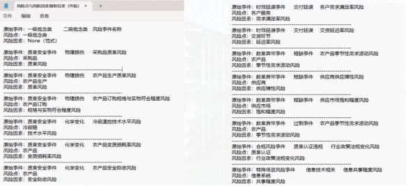 回答:在人工处理部分,制定了详细且明确的操作指南准则。针对风险事件抽取、风险因素-风险点抽取等不同任务,都规定了具体的抽取规则和流程。在风险事件抽取时,明确了以各类风险事件发生词作为触发词,像“减产”“滞销”等,并针对不同生鲜供应链场景设置了对应的特征词表。人工校验时,严格依据这些规则进行判断,确保抽取的风险事件符合模式层的定义。