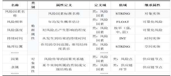 (2)知识图谱模式层构建:以实体类层次体系(风险因素、风险点、风险事件、应对措施、供应链环节)、实体属性与实体间关系为核心设计知识图谱模式层。类层次体系将依据不同实体的特性划分其各级概念类的标准进行构建;属性将依照语义精确性,继承性以及特异性进行设计;为突出论文研究重点将风险知识间关系设置为六大核心关系,其内容会在图3进行详细展示。为较为全面展示模式层内容,我将以图1风险点类层次构建部分内容,图2风险因素属性构建部分内容以及图3六大核心关系构建内容进行展示。