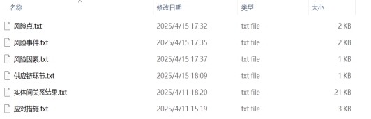 (3)知识图谱数据层构建:数据层构建是基于图谱模式层的对风险知识的定义,对相关参考文献中所需的实体,属性以及关系进行抽取。对于数据层抽取我将采取先抽取风险事件与应对措施的实体与关系,并在风险事件抽取结果的基础上抽取风险点-风险因素的实体,属性以及关系。其数据层构建过程中共抽取194个实体及326组核心关系,并将其存储至对应的TXT文件中,从而为后续图谱可视化做铺垫。为较为全面展示其内容,将用下图4数据层抽取结果,图5风险点-风险因素属性实体抽取结果,图6风险点-风险因素属性抽取结果,图7风险点-风险因素关系抽取结果所示。