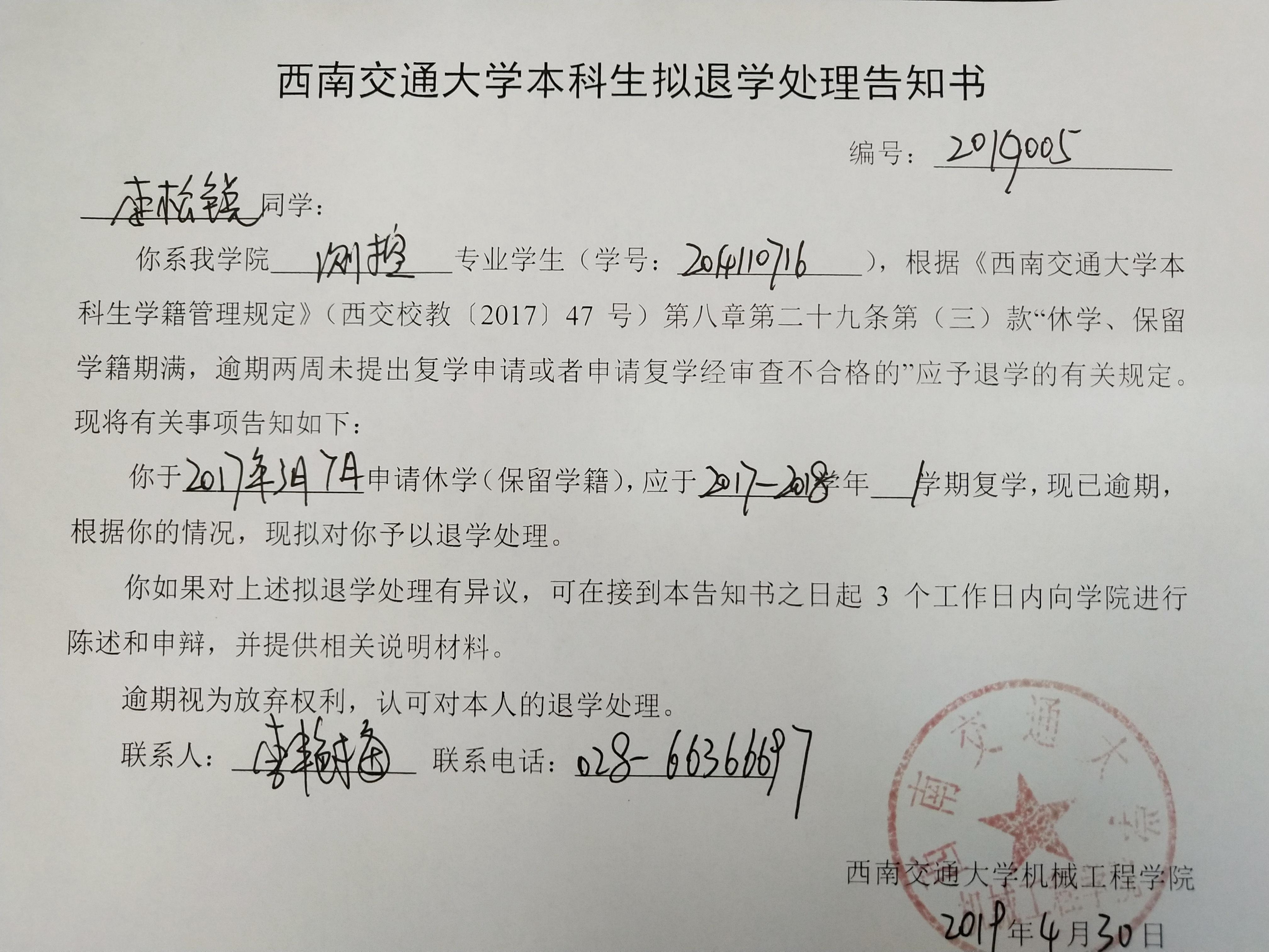关于拟对李松锐、张文成2名同学作出退学处理的告知书