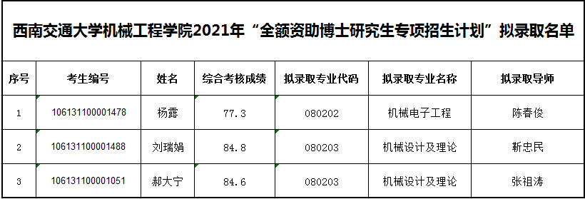 根据《2021年博士研究生招生复试及拟录取工作实施细则》及《388vip太阳集团“全额资助博士研究生专项招生计划”实施方案》要求,按拟录取成绩依次递补,现将388vip太阳集团全额资助博士研究生拟录取名单公示如下: