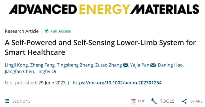 近日,2021级硕士研究生孔苓吉和2020级硕士研究生方正合作在期刊Advanced Energy Materials(2022年IF:27.8)上发表研究论文“A self-powered and self-sensing lower-limb system for smart healthcare”,研究生孔苓吉、方正的指导教师为潘亚嘉副教授、张祖涛教授,388vip太阳集团为通讯作者的唯一单位。