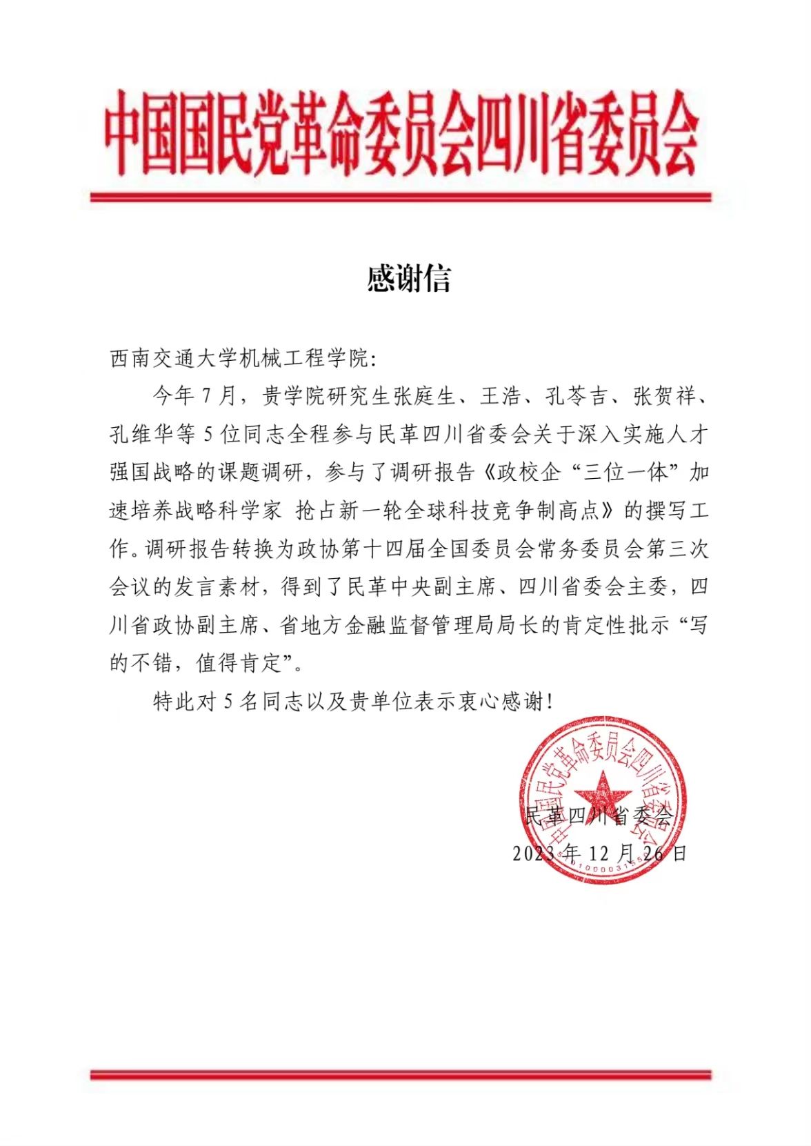 民革四川省委来信感谢机械公司研究生协助完成调研报告