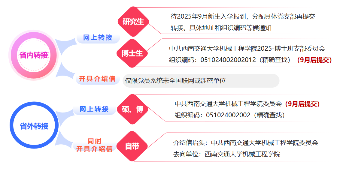 二、转接时间:因暑假及入党材料审查工作需一定时间(约10月中旬完成审查),超90天未被党组织接收的党员信息将被系统自动退回。请新生党员所在党组织于2025年9月后发起网络转接。介绍信由新生党员自行携带。