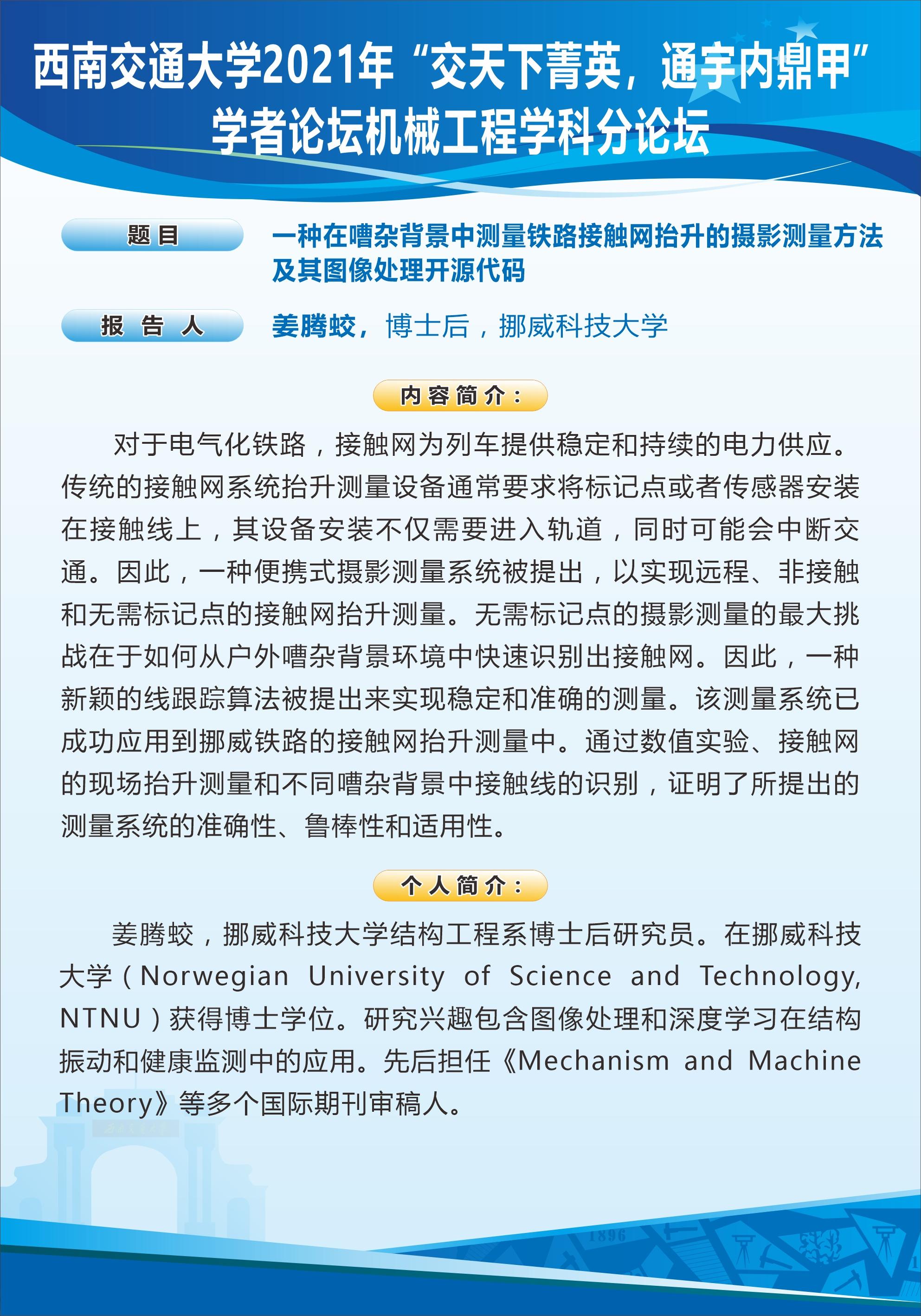 题目:一种在嘈杂背景中测量铁路接触网抬升的摄影测量方法及其图像处理开源代码 报告人:姜腾蛟,博士后,挪威科技大学 |