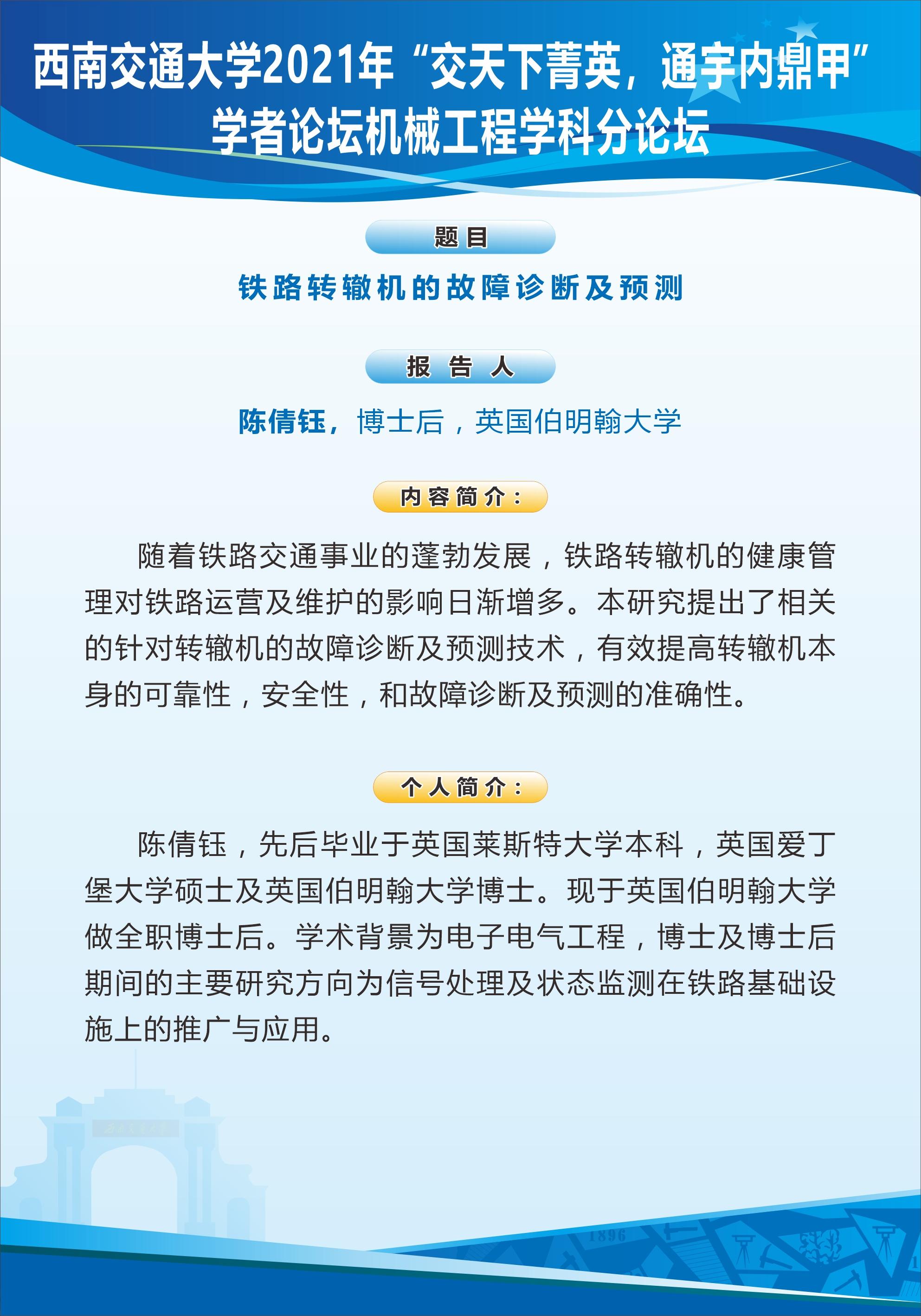 题目:铁路转辙机的故障诊断及预测 报告人:陈倩钰,博士后,英国伯明翰大学 |