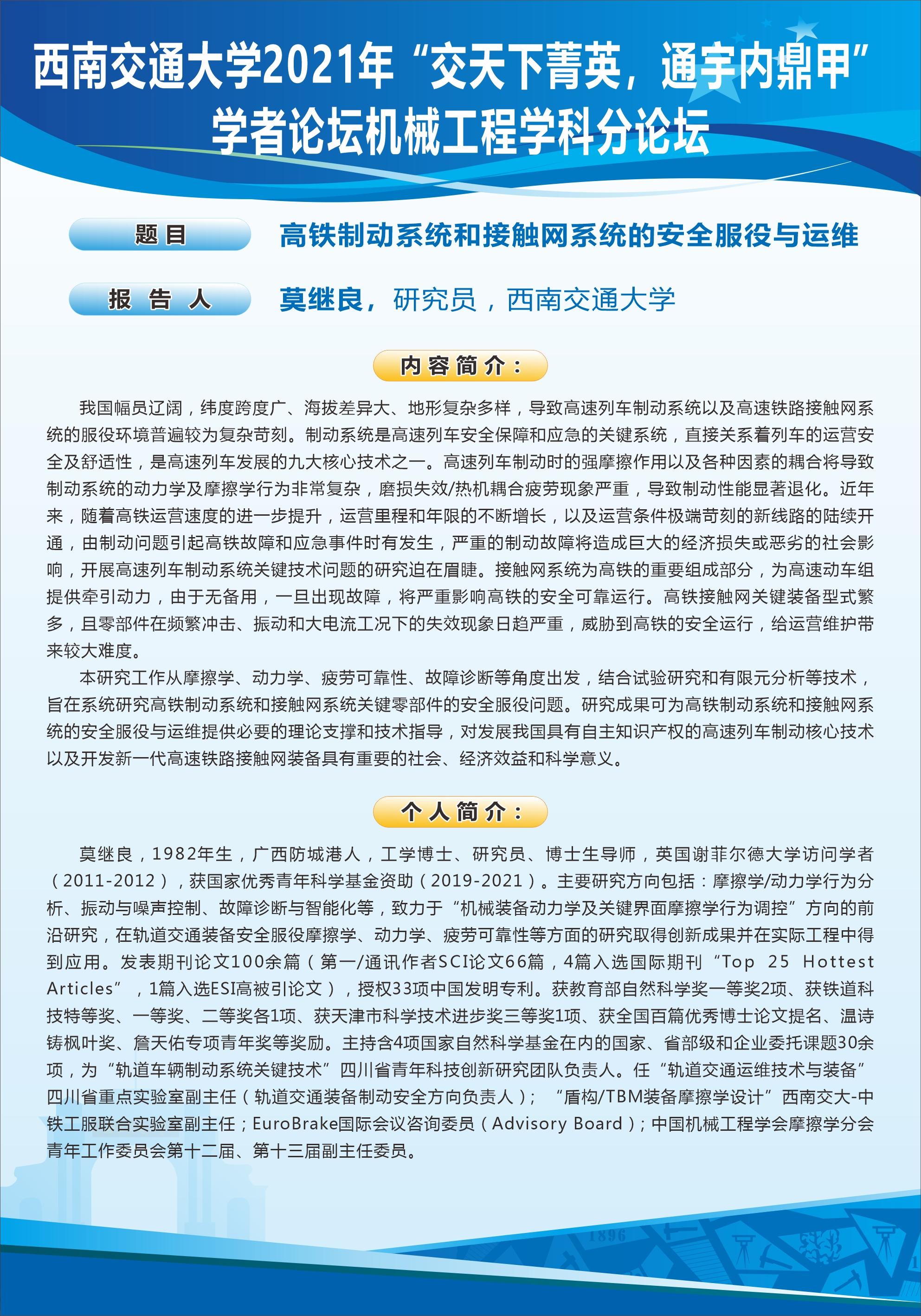 题目:高铁制动系统和接触网系统的安全服役与运维 报告人:莫继良,研究员,388vip太阳集团 |